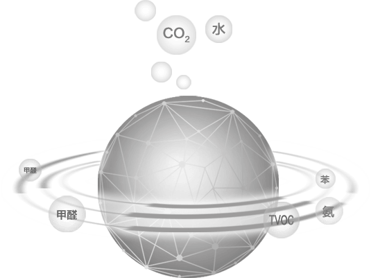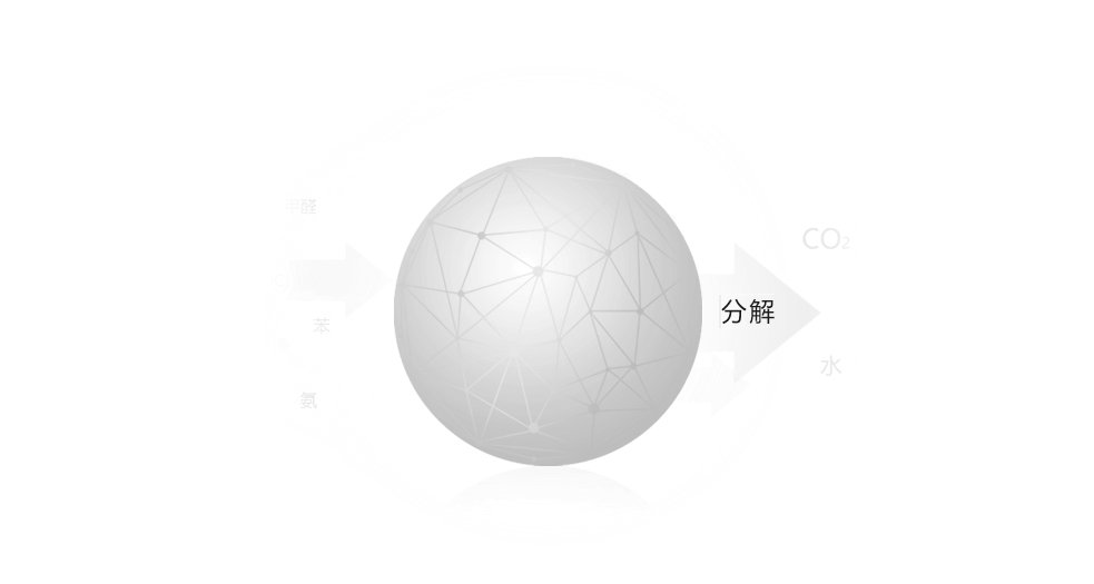 將甲醛、苯系物、TVOC等有害氣體分解成水、CO2 。固態光觸媒。具有吸附、鎖定、分解三大功能,