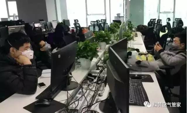 幾間小的辦公室還待裝修,沿著過道進(jìn)入三間較大的辦公區(qū)域,地面基本完工,但墻面和吊頂還在施工。一邊是正在攀爬扶梯的施工工人,一邊則是對著電腦辦公的公司員工,每個人面前擺滿了綠蘿,辦公大廳窗戶全開,近10臺空氣過濾器全部啟動,發(fā)出“呼呼”的聲音。